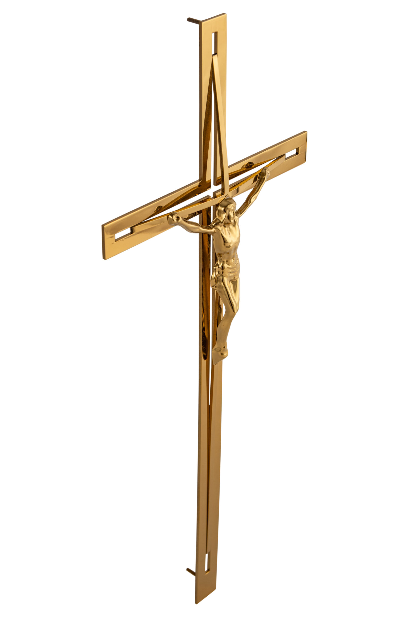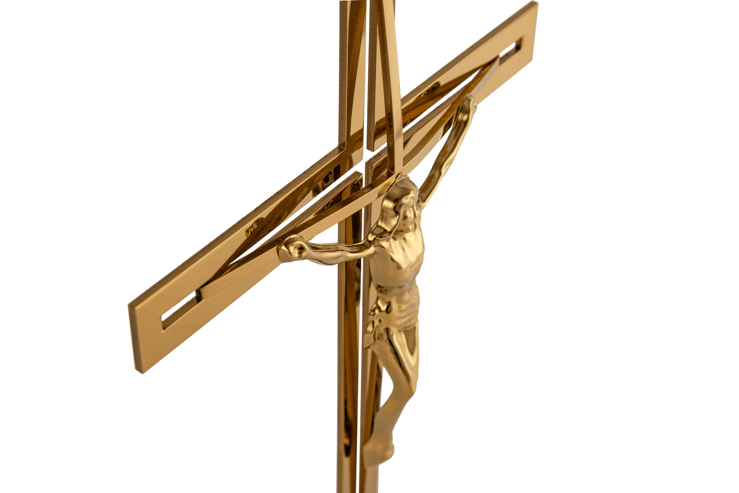 Płaski krzyż ze stali nierdzewnej z wystającym łukiem w kolorze złotym z pasyjką. Kolor uzyskiwany jest poprzez reakcje chemiczną, która wchodzi wgłąb materiału. Dzięki temu kolor nie łuszczy się, nie schodzi oraz w momencie porysowania nie widać koloru srebrnego.